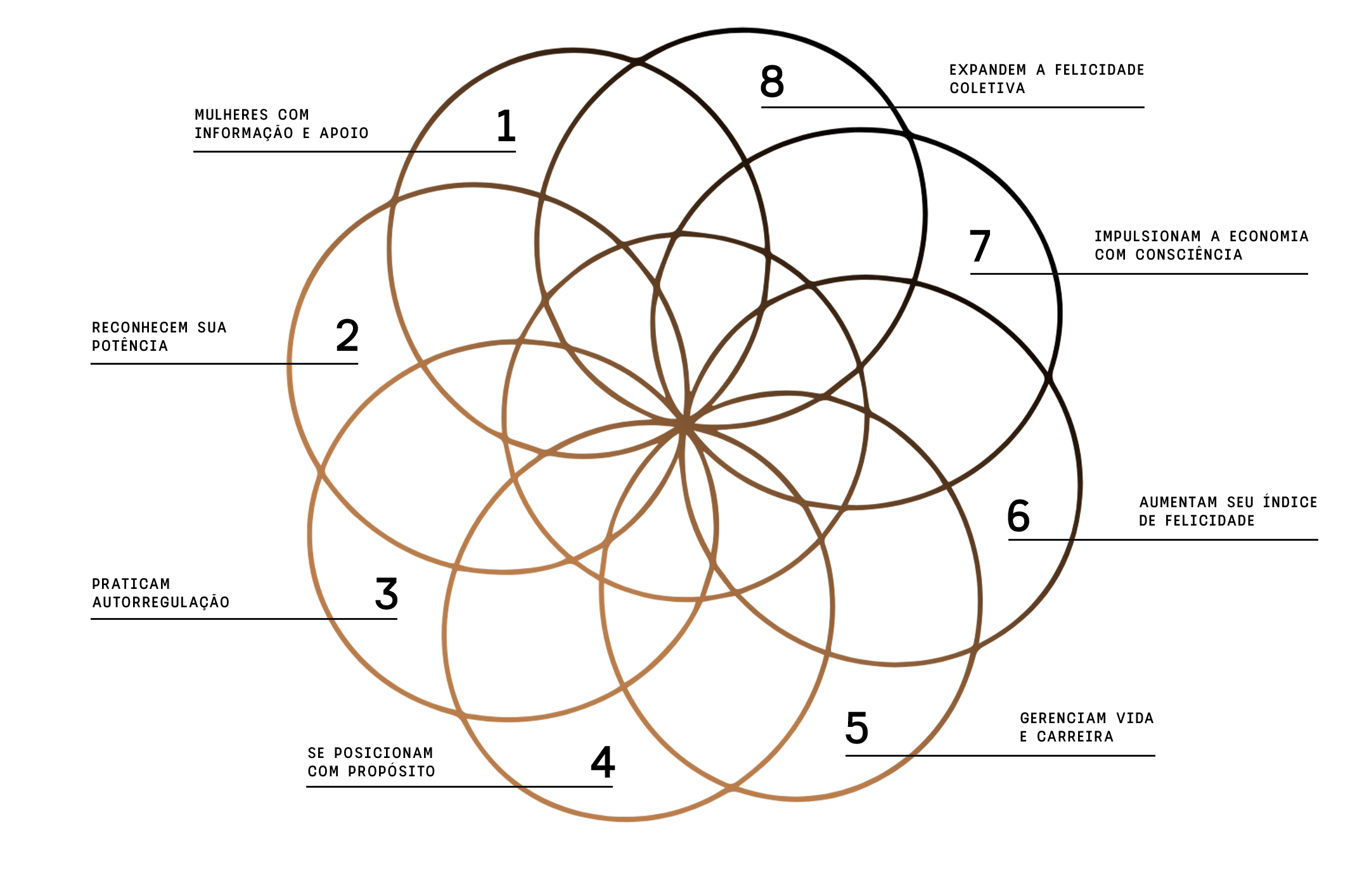 A felicidade feminina não é apenas um estado emocional. É um sistema de desenvolvimento. De informação à consciência, de consciência à ação, cada ciclo da mandala representa um passo no caminho da felicidade como prática individual e coletiva.